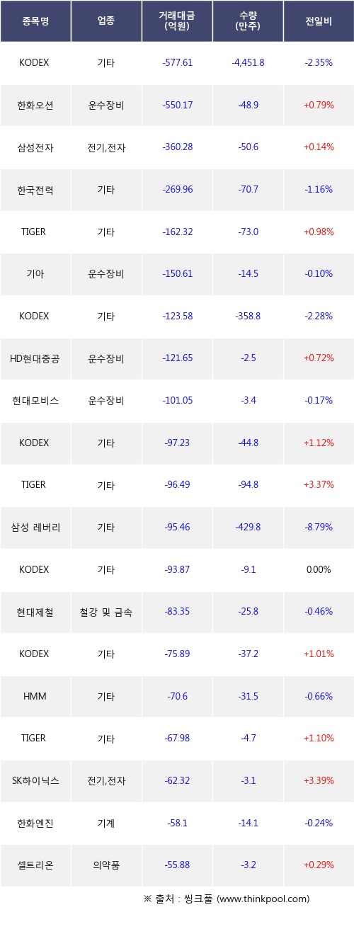 기관 투자자의 순매도 상위 20개 종목은 KODEX 200선물인버스2X, 한화오션, 삼성전자, 한국전력, TIGER 미국S&P500, 기아, KODEX 코스닥150선물인버스, HD현대중공업, 현대모비스, KODEX 미국나스닥100등이다.