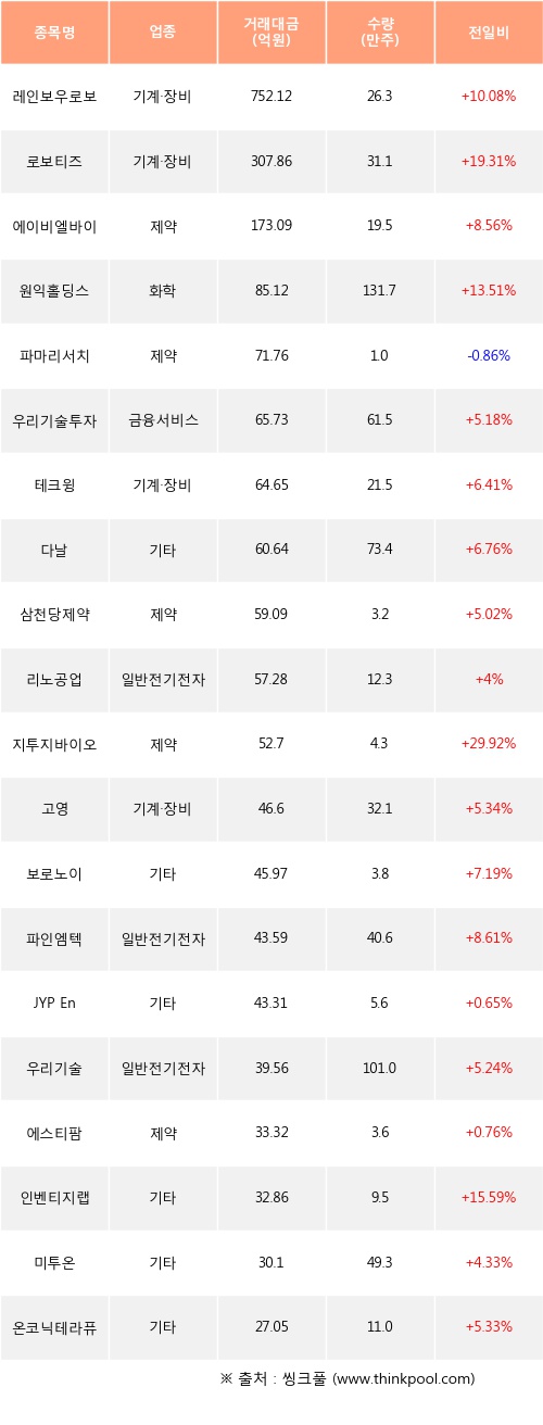 레인보우로보틱스, 로보티즈, 에이비엘바이오 등은 전일 대비 주가가 상승했고, 파마리서치 등은 주가가 하락했다.