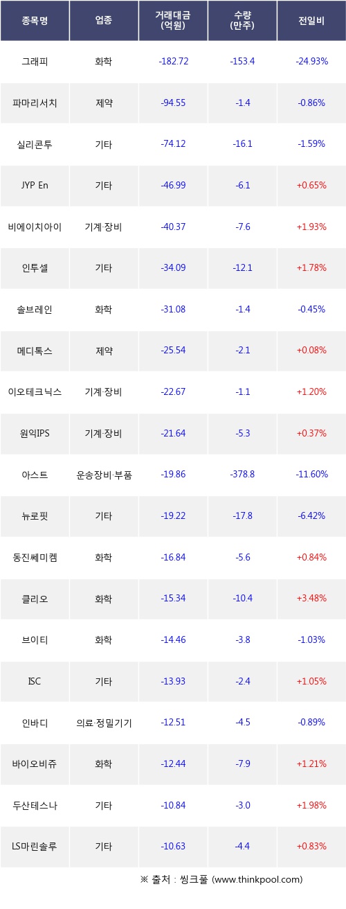 기관 투자자의 순매도 상위 20개 종목은 그래피, 파마리서치, 실리콘투, JYP Ent., 비에이치아이, 인투셀, 솔브레인, 메디톡스, 이오테크닉스, 원익IPS등이다.