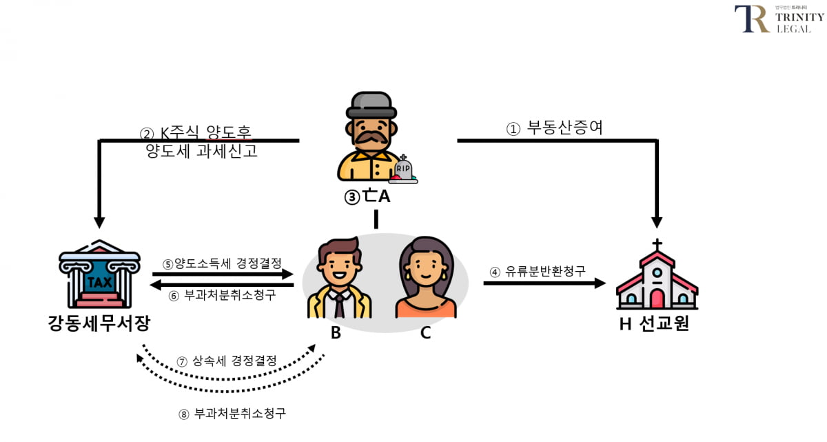 주식회사 K의 대표이사 A씨는 2007년 12월께 K사 주식 5000주를 1주당 40만원에 양도하고도 1주당 1만원에 양도한 것으로 양도소득세를 과소 신고했습니다. 이를 확인한 강동세무서장은 2011년 7월 A씨에게 2007년 귀속 양도소득세 약 10억원을 부과하는 고지서를 발송했으나, 고지서가 반송되면서 A씨가 2010년 12월 사망한 사실을 알게 됐습니다. 또한 A씨의 상속재산이 확인되지 않자 2011년 8월 위 부과처분을 철회했습니다.A씨는 자녀로 B씨와 C씨를 뒀으나 평소 자녀들과 사이가 좋지 않았던 A씨는 자신이 소유한 남양주시 별내동 토지 24필지를 모두 H선교원에 증여했습니다. B씨와 C씨는 A씨가 사망한 후인 2011년 7월 H선교원을 상대로 유류분반환 소송을 제기해 2014년 6월 승소 판결을 받았고, 이 판결은 2016년 7월 확정됐습니다. B씨와 C씨는 2017년 1월 위 판결에 따라 반환받은 상속재산에 대한 상속세를 신고했는데, 강동세무서장은 2017년 12월 납부불성실가산세를 추가한 2007년 귀속 양도소득세 약 14억원을 결정, 고지했습니다. 그러자 원고들은 조세심판원에 위 부과처분의 취소를 구하는 심판청구를 했고, 조세심판원은 2019년 6월 부과제척기간 경과를 이유로 위 부과처분을 취소했습니다.