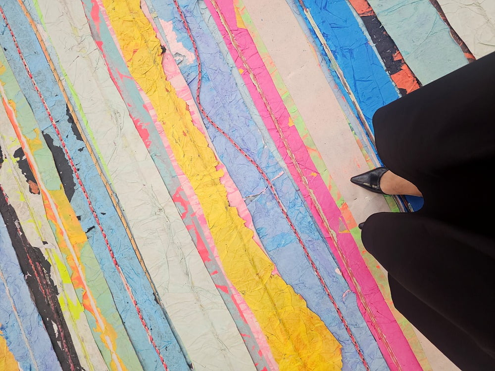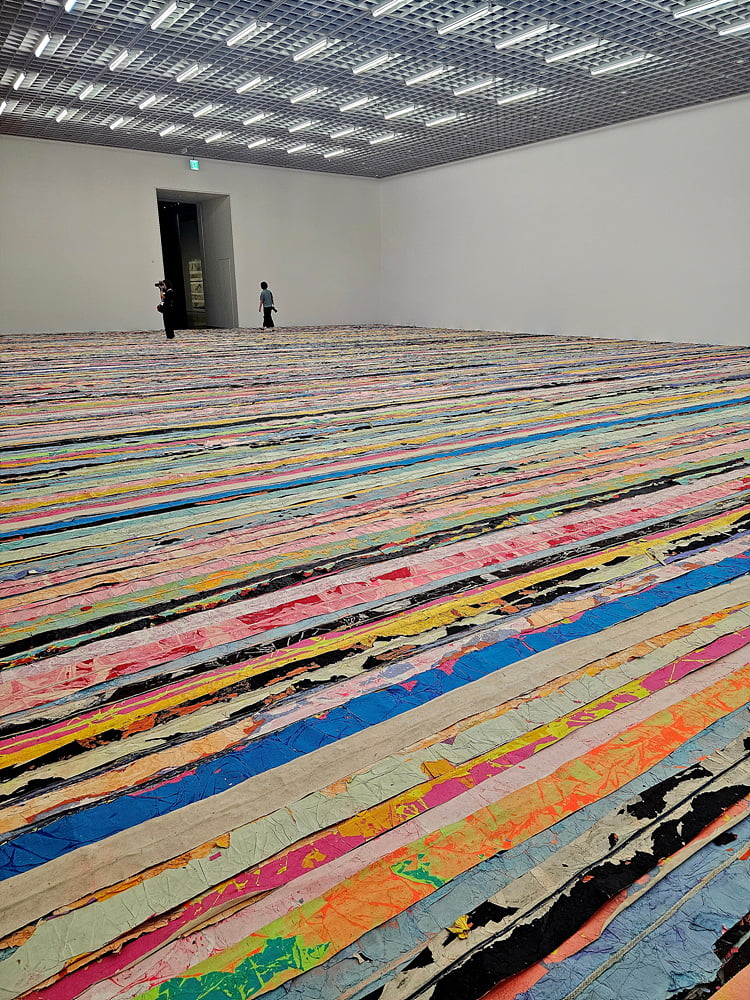 아모레퍼시픽미술관에서 내년 1월 25일까지 열리는 <Mark Bradford: Keep Walking> 기획전은 노동이 예술이고, 예술이 노동이 되는 거대한 삶의 현장을 보는 듯하다. 전시장 바닥 전체를 덮는 거대한 작품, ‘떠오르다’는 거리에서 수집한 부산물들을 긴 띠의 형태로 재단하고 노끈으로 이어 붙인 회화적 설치물이다. 관람객은 직접 그 위를 걸어보며 마크 브래드포드의 변화하는 작업에 참여할 수 있다. 부산물들의 움직임과 색색의 표면을 눈과 발끝으로 지켜보는 것은 흥미롭다.