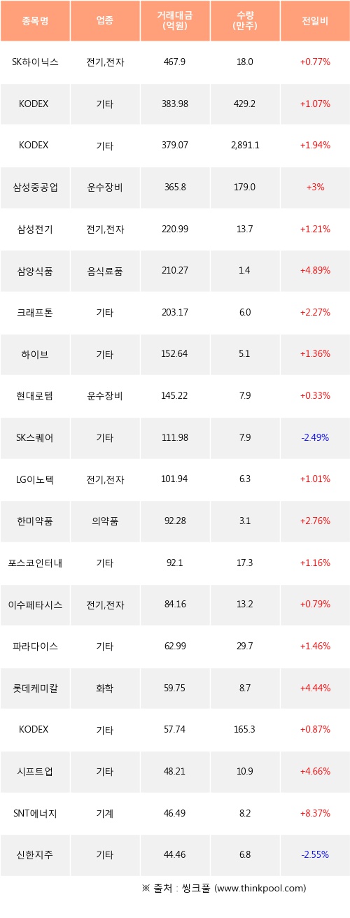 SK하이닉스, KODEX 코스닥150레버리지, KODEX 200선물인버스2X 등은 전일 대비 주가가 상승했고, SK스퀘어, 신한지주 등은 주가가 하락했다.