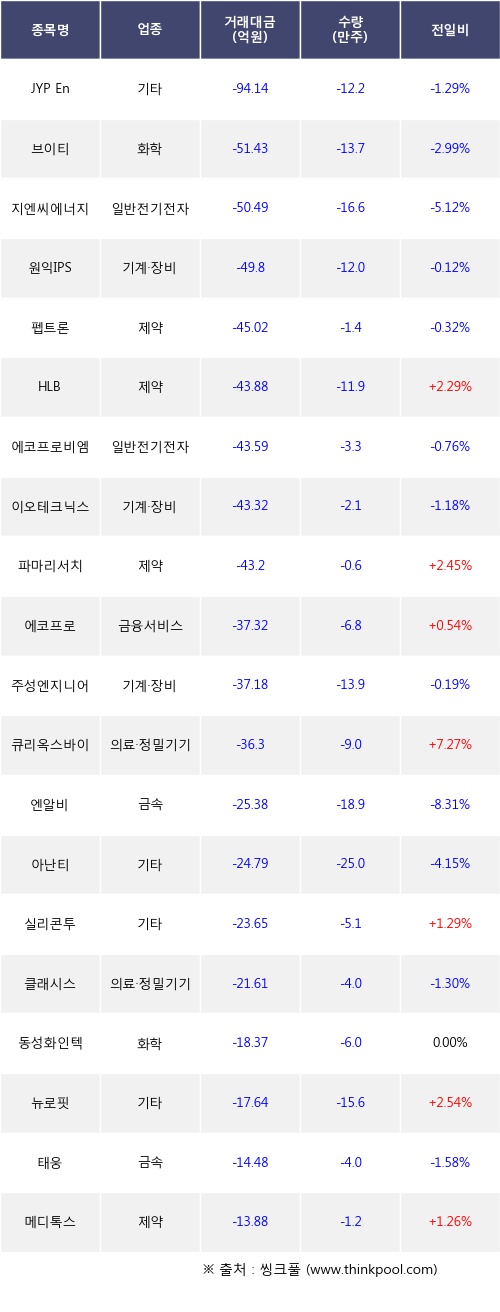 기관 투자자의 순매도 상위 20개 종목은 JYP Ent., 브이티, 지엔씨에너지, 원익IPS, 펩트론, HLB, 에코프로비엠, 이오테크닉스, 파마리서치, 에코프로등이다.