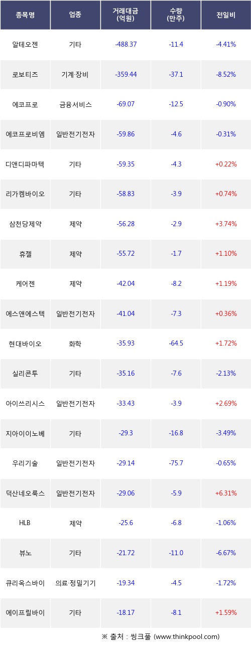 외국인 투자자의 순매도 상위 20개 종목은 알테오젠, 로보티즈, 에코프로, 에코프로비엠, 디앤디파마텍, 리가켐바이오, 삼천당제약, 휴젤, 케어젠, 에스앤에스텍등이다.