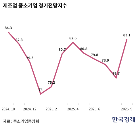 중소기업중앙회는 3087개 중소기업을 대상으로 실시한 ‘2025년 9월 중소기업 경기전망조사’ 결과를 28일 발표했다. 이달 업황전망 경기전망지수(SBHI)는 80.3으로 전월대비 5.7포인트 상승했다. 전년동월(77.4) 대비로는 2.9포인트 올랐다.
