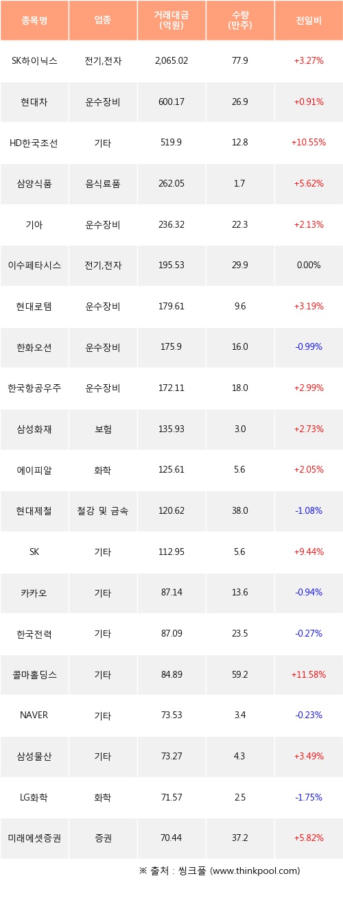 SK하이닉스, 현대차, HD한국조선해양 등은 전일 대비 주가가 상승했고, 한화오션, 현대제철, 카카오 등은 주가가 하락했다.