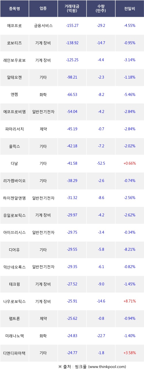 외국인 투자자의 순매도 상위 20개 종목은 에코프로, 로보티즈, 레인보우로보틱스, 알테오젠, 엔켐, 에코프로비엠, 파마리서치, 올릭스, 다날, 리가켐바이오등이다.