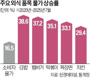 주요 외식 품목 가운데 김밥 가격 상승세가 38.6%로 두드러졌다. 햄버거(37.2%) 떡볶이(35.1%) 짜장면(33.1%) 가격도 크게 올랐다. 치킨은 29.4% 급등했다.