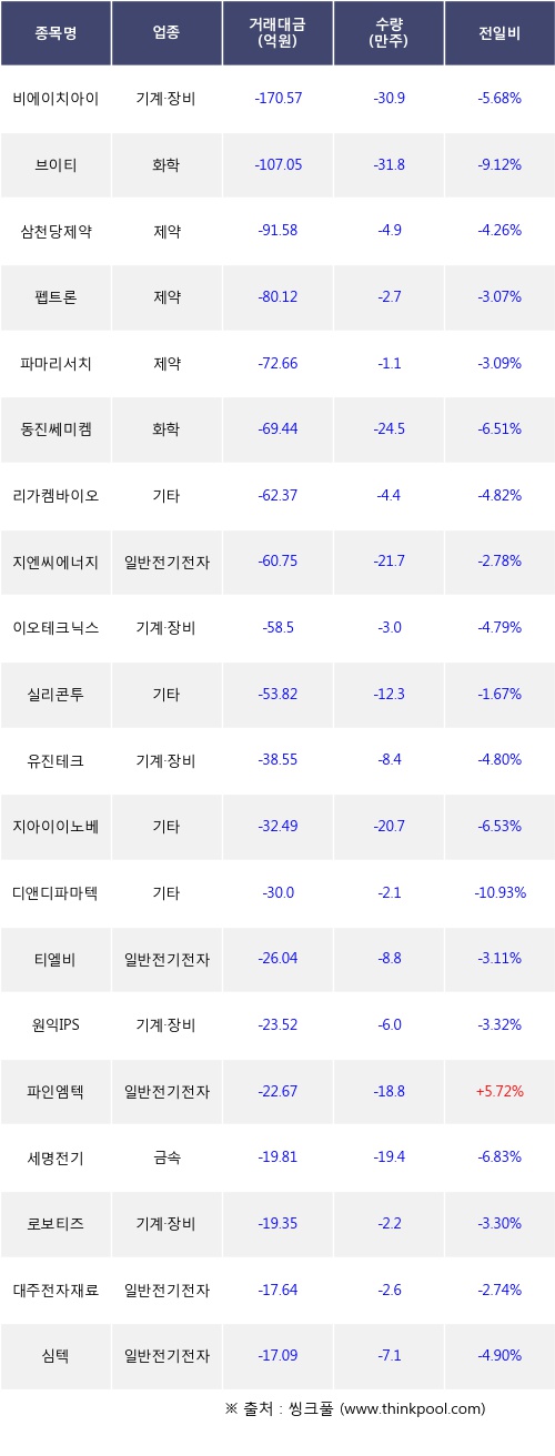 기관 투자자의 순매도 상위 20개 종목은 비에이치아이, 브이티, 삼천당제약, 펩트론, 파마리서치, 동진쎄미켐, 리가켐바이오, 지엔씨에너지, 이오테크닉스, 실리콘투등이다.