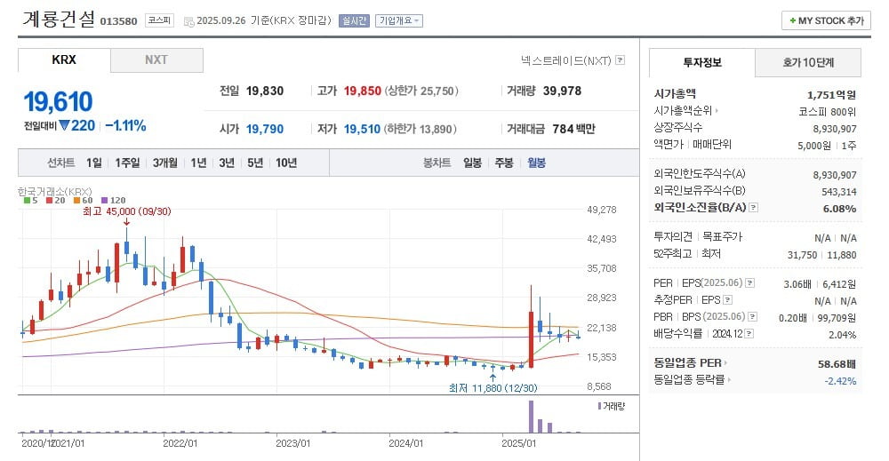 이재명 대통령의 행정수도 이전 공약으로 올 4월 23일 주가가 3만1750원까지 치솟았다. 단기간에 이뤄지는 정책이 아닌 만큼 현재 주가는 연고점 대비 38.24% 하락했다.