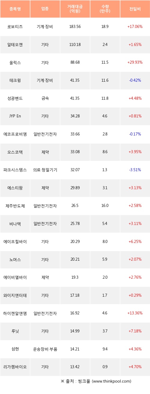 기관 투자자의 순매수 상위 20개 종목은 로보티즈, 알테오젠, 올릭스, 테크윙, 성광벤드, JYP Ent., 에코프로비엠, 오스코텍, 파크시스템스, 에스티팜등이다.