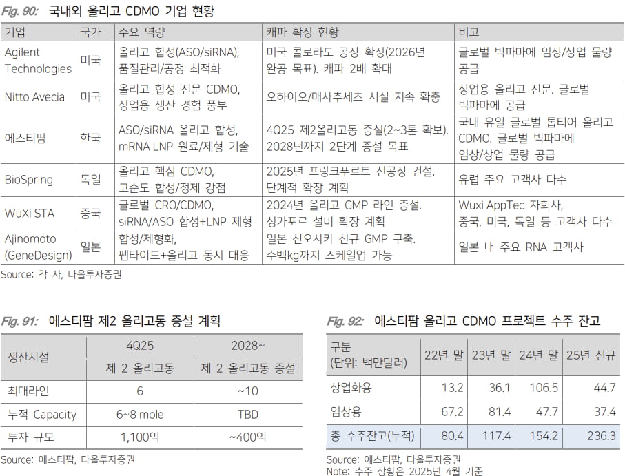 RNA 치료제 생산은 고체상·액체상 합성(PS 결합), 대형 정제(HPLC/UF), 결합체(Conjugate) 공정(GalNac/지질), 고순도 QC, 대량 용매 처리 등 고난도 기술을 요구한다. 이 때문에 글로벌 기업들은 대규모 상업 생산을 외부 위탁개발생산(CDMO)에 의존하는 구조다. 이 연구원은 “ASO·siRNA 승인 및 임상 증가로 글로벌 외주 수요가 확대되고 있으며 주요 CDMO 기업들은 이에 대응해 생산능력을 잇따라 증설하고 있다”고 말했다.