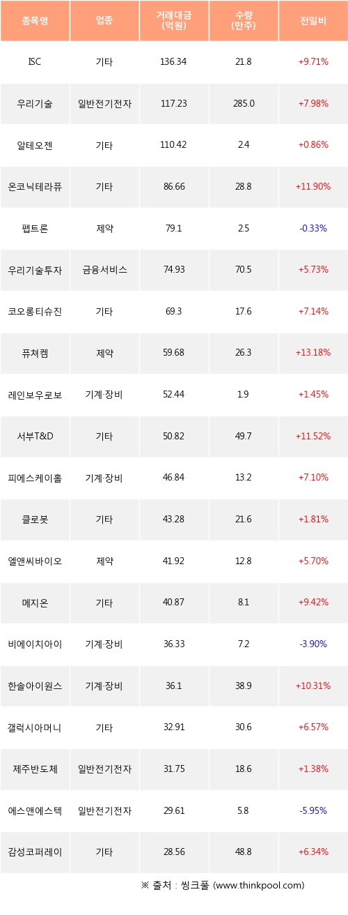 외국인 투자자의 순매수 상위 20개 종목은 ISC, 우리기술, 알테오젠, 온코닉테라퓨틱스, 펩트론, 우리기술투자, 코오롱티슈진, 퓨쳐켐, 레인보우로보틱스, 서부T&D등이다.