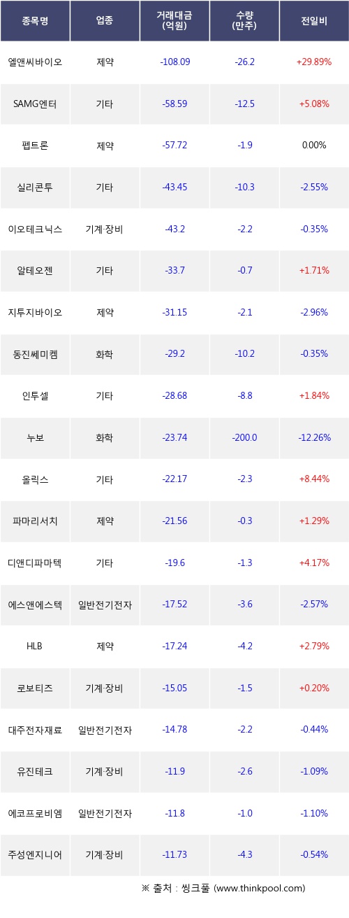 기관 투자자의 순매도 상위 20개 종목은 엘앤씨바이오, SAMG엔터, 펩트론, 실리콘투, 이오테크닉스, 알테오젠, 지투지바이오, 동진쎄미켐, 인투셀, 누보등이다.