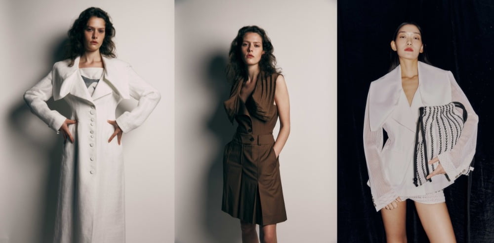 이번에 그녀가 내세운 주제는 “Quiet Strength, Living Heritage”. 여성의 내적인 강인함이 투영된 옷에 우리의 살아있는 문화유산 디테일을 더했다. 디자인 테마는 한옥 지붕에 쓰이는 기와. 기와는 유려한 곡선이 겹겹이 이어지는 흐름이 특징. 치마, 상의, 원피스 등 모든 작품에 흐르듯 이어지는 기와 모티브를 녹였다. 특히 목 부분 옷깃을 기와 모양에서 변주한 디자인이 핵심으로, 모시 등 우리 전통 원단에 장인들이 하나하나 수작업으로 작업해 예술적 완성도를 높였다.