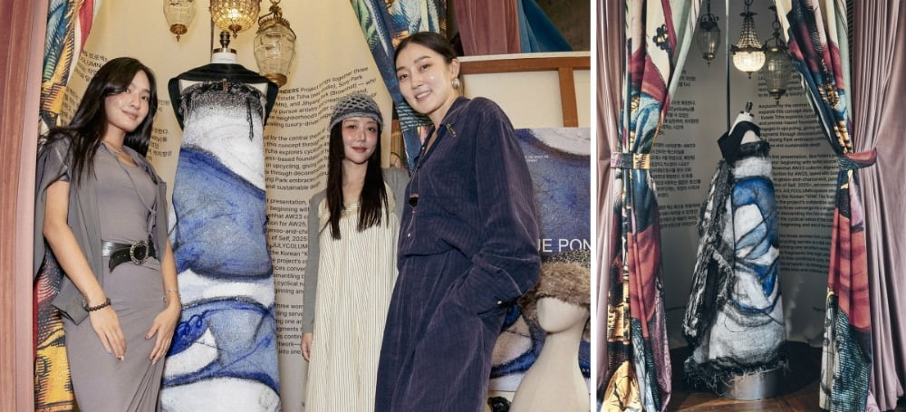 그녀는 ‘윗세대 옷으로 다시 만든 옷에는 이중의 기억과 서사가 담겨있기에 입는 유산’이라고 정의한다. 선대의 옷과 옷감을 활용해 만든 패션에 자기만의 철학을 담는 예술 작업이 여타의 디자이너와 차별화되는 지점. 이번 서울패션위크에서 그녀는 다른 여성 예술가(에스텔 차, 박지향)들과 연대해 함께 한 전시도 선보였다. 3명의 여성 예술가는 순환(cycle)을 주제로 협업 프로젝트를 통해 회화, 패션, 설치 예술이 망라된 전시로 서울패션위크의 예술적 다양성에 일조했다.