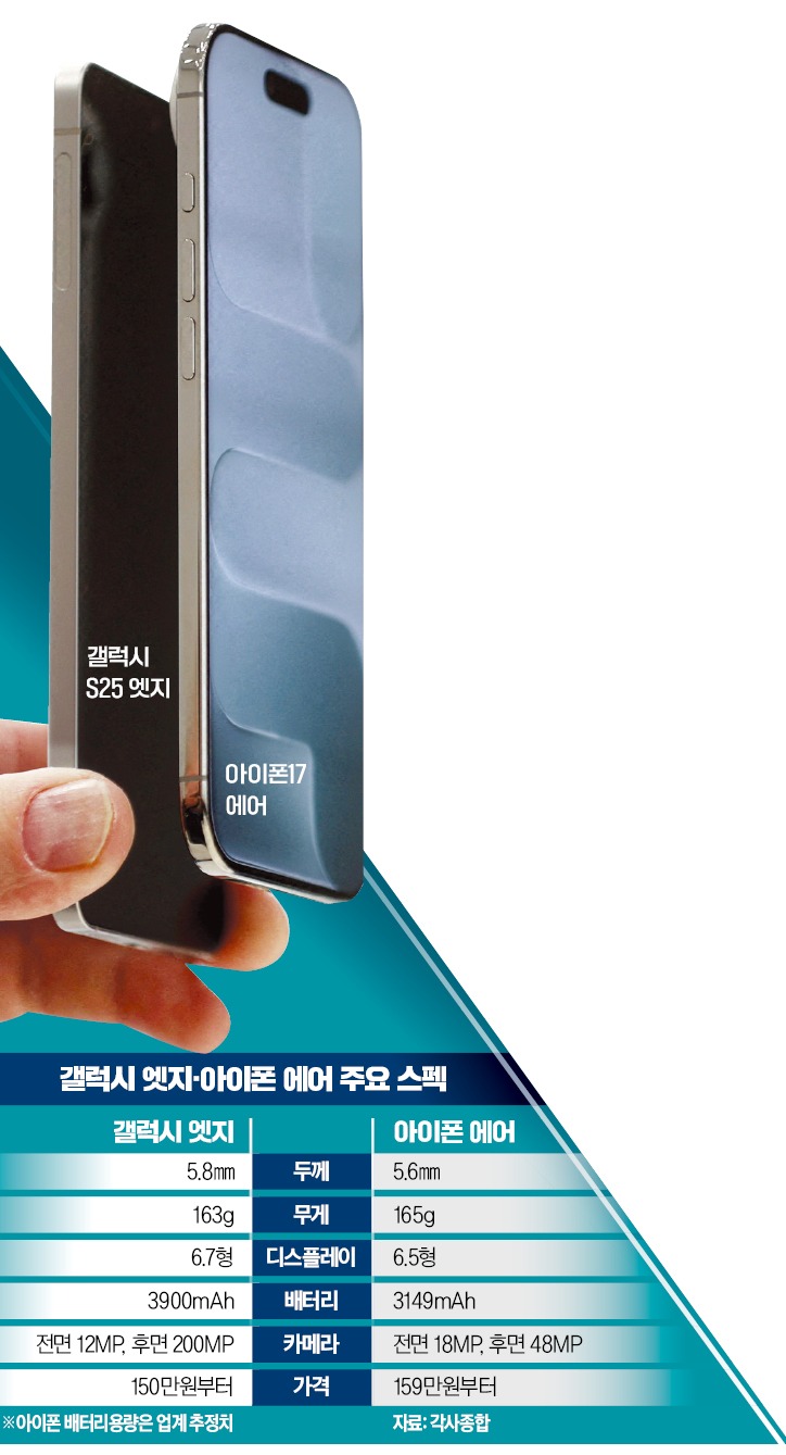 팀 쿡 애플 최고경영자(CEO)는 이날 신제품 발표회에서 “아이폰 에어는 그 어떤 제품과도 비교가 불가하다”며 “아이폰 에어는 완전히 새로운 게임체인저”라고 강조했다. 삼성은 올 하반기 두 번 접는 초박형 ‘트라이폴드’ 폴더블폰을 출시해 초슬림 주도권을 이어간다는 계획이다.