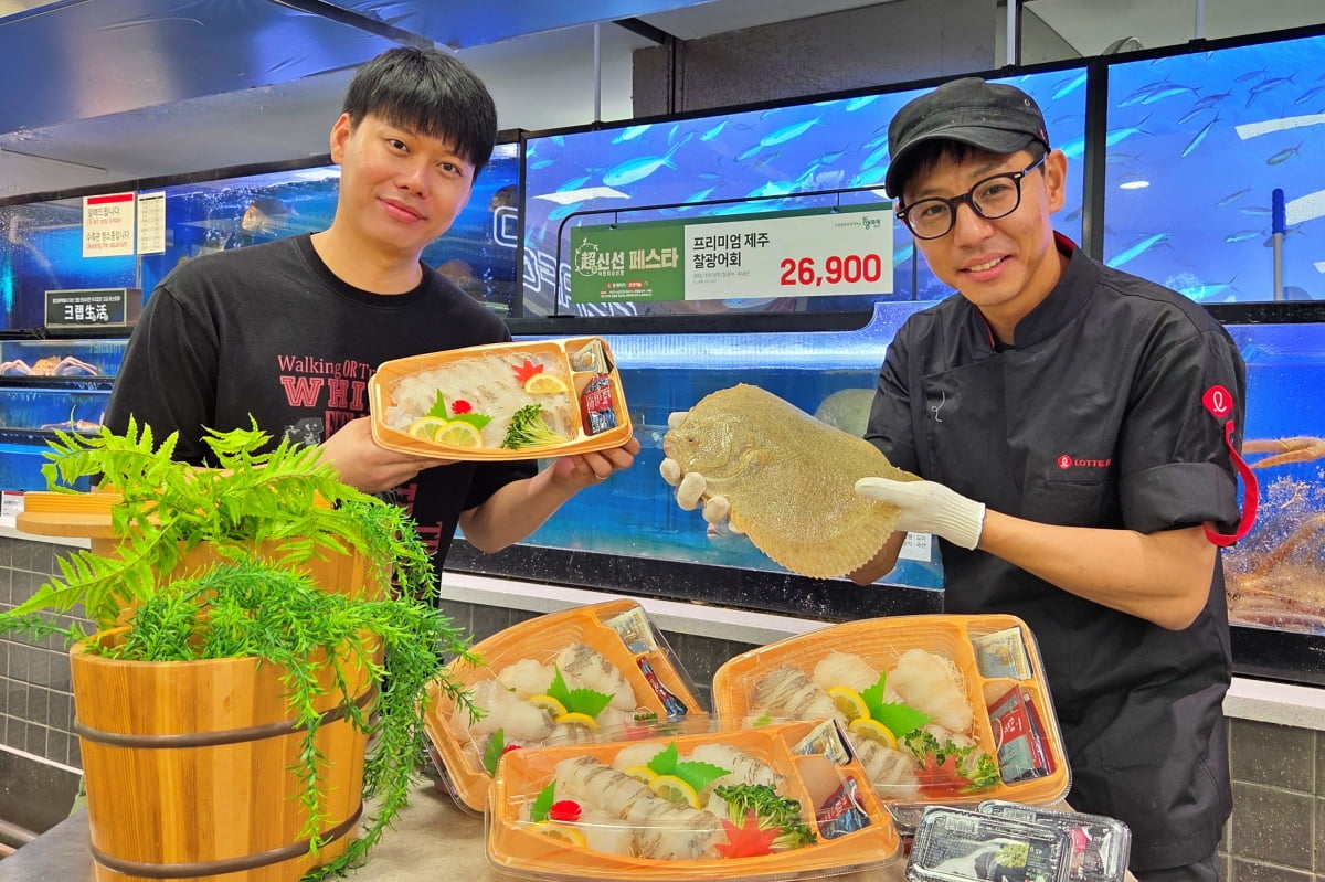 찰광어는 유럽산 가자미의 일종인 터봇을 제주에서 양식한 어종으로, 일반 광어보다 육질이 단단하고 쫄깃해 ‘찰광어'라는 이름이 붙었다. 롯데마트의 제주산 찰광어회는 300g에 가격이 2만6900원으로 책정됐다. 오는 17일까지 일주일 동안 판매한다.