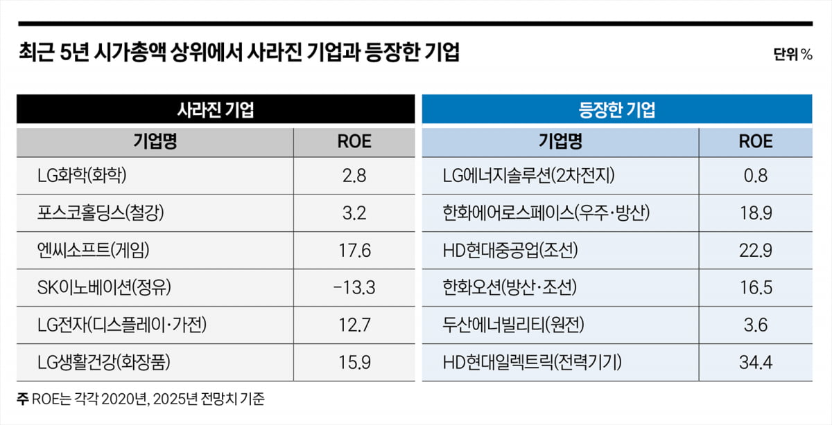 시총 상위권에 새로 진입한 기업은 LG에너지솔루션(2차전지), 한화에어로스페이스(우주·방산), HD현대중공업(조선), 한화오션(방산·조선), 두산에너빌리티(원전), HD현대일렉트릭(전력기기) 등 6곳이다. 이 중 HD현대일렉트릭의 올해 ROE는 34.4%에 달할 것으로 전망된다. 인공지능(AI) 붐 등을 타고 전력 수요가 급증한 덕이다. 김종민 삼성증권 수석연구위원은 “AI 반도체와 전력기기의 상승 추세는 꺾이지 않을 것”이라며 “글로벌 패러다임이 전환된 업종은 누구도 예측하지 못한 성장 경로를 걸어갈 수 있다”고 내다봤다.