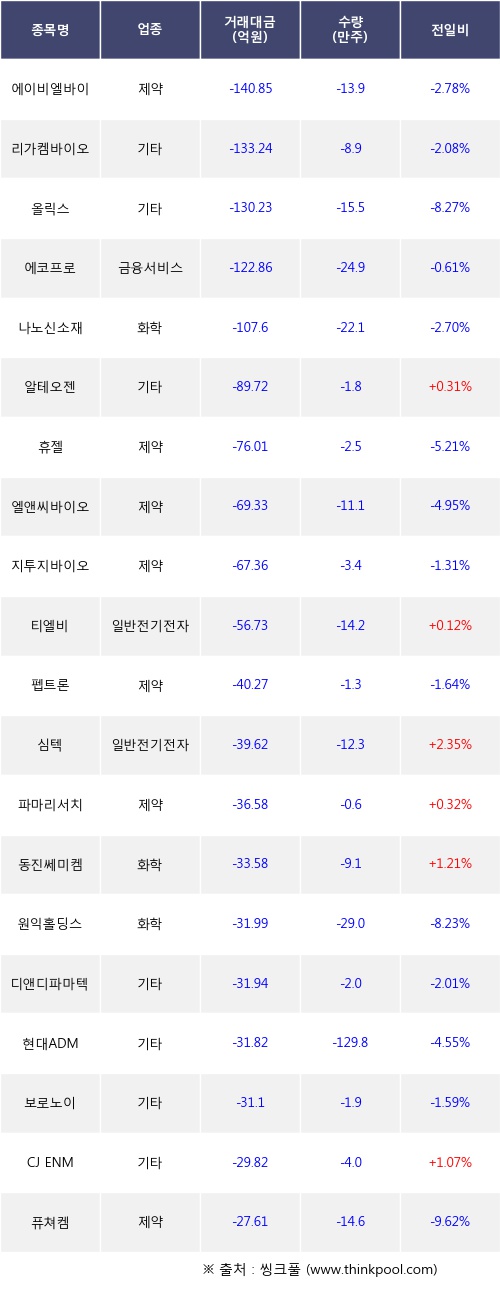 기관 투자자의 순매도 상위 20개 종목은 에이비엘바이오, 리가켐바이오, 올릭스, 에코프로, 나노신소재, 알테오젠, 휴젤, 엘앤씨바이오, 지투지바이오, 티엘비등이다.