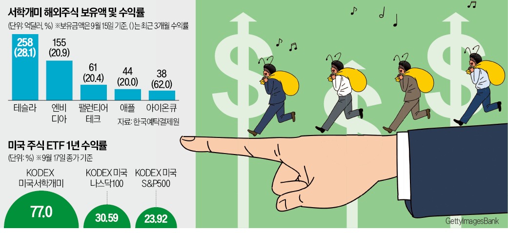 양자컴퓨팅 대표주인 아이온큐도 서학개미 수익률에 힘을 보탰다. 아이온큐는 한국계 김정상 듀크대 교수가 창업한 기업으로 투자자 사이에서 ‘명예 한국 기업’으로 불린다. 시총이 185억달러인데 국내 투자자 보유 금액만 38억달러에 달하기 때문이다. 아이온큐 주가는 이달 들어서만 45.7% 급등하며 시장을 달구고 있다. B라일리파이낸셜은 아이온큐 목표주가를 61달러에서 75달러로 올리며 “상당한 상업적 잠재력을 갖춘 기술 선도 기업”이라고 평가했다.이 밖에 서학개미의 주식 보유 금액 2위인 엔비디아(155억달러), 3위 팰런티어(61억달러), 4위 애플(44억달러) 등도 3개월 새 20% 넘게 급등했다. 임태혁 삼성자산운용 ETF운용본부장은 “데이터를 살펴보면 해외 주식 투자자는 국내 주식 투자자보다 장기 투자하는 경향이 뚜렷하고, 시장 트렌드를 빠르게 따라가는 흐름을 관찰할 수 있다”며 “최근 미래 기술주들이 급등해 수익률이 큰 폭으로 올랐다”고 설명했다.