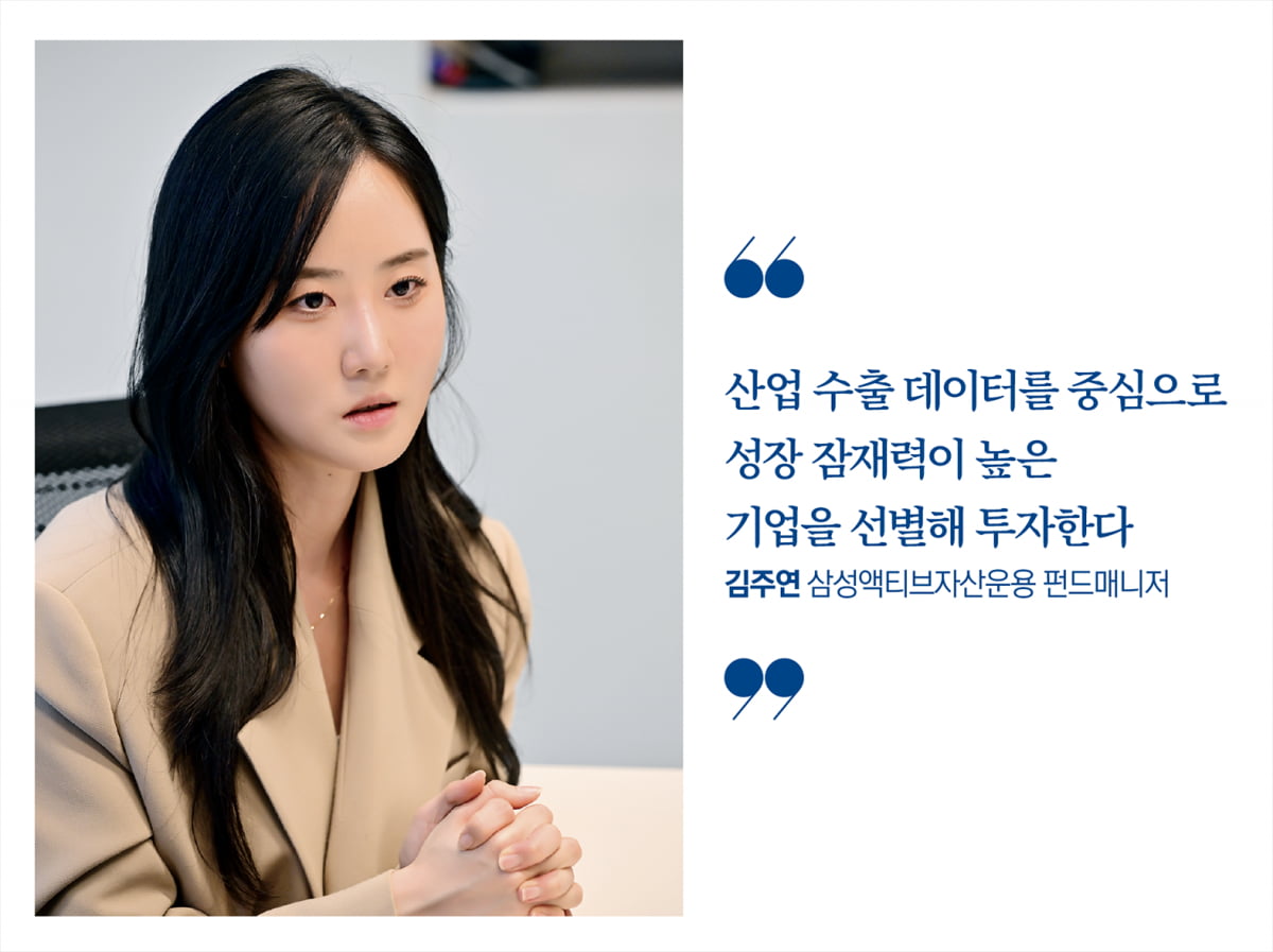김주연 매니저(이하 김 매니저) “국내 주식형 ETF인 ‘KoAct K수출핵심기업TOP30액티브ETF’를 맡고 있다. 저희 하우스의 기본 투자 철학은 세상의 변화에 투자하는 것이다. 제가 운용하는 ETF는 세계적 트렌드 속에서 특히 국내 산업 경쟁력이 높은 기업에 주로 투자한다. 과거 주도 산업 대부분이 수출 중심 기업에서 나오듯, 저희도 글로벌 수요와 트렌드에 맞춰 성장 가능성이 높은 기업을 수출 데이터를 기반으로 발굴하고 투자한다.”