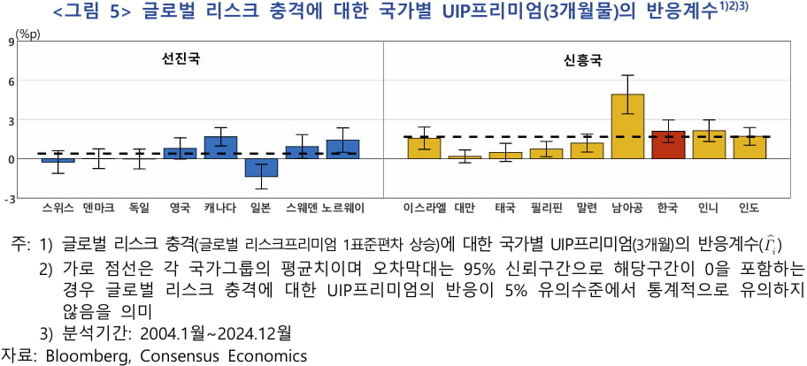 한국의 경우 글로벌 충격 발생 시 UIP프리미엄이 2.11%포인트 상승하는 것으로 분석됐다. 위기시 더 많은 자금조달 비용이 드는 국가인 것이다. UIP프리미엄 상승폭이 5% 안팎인 남아공을 제외하면 가장 컸다. 인도네시아가 한국과 비슷한 수준인 것으로 나타났다.