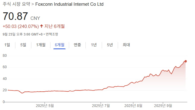 23일 상하이증권거래소에 따르면 이날 폭스콘산업인터넷은 0.52% 상승한 70.87위안에 거래를 마쳤다. 올 들어 주가가 242.20% 뛰었다. 2018년 상장 이래로 257.39% 오른 점을 고려하면 상승분은 대부분 최근 반년(240.07%) 사이에 집중됐다.
