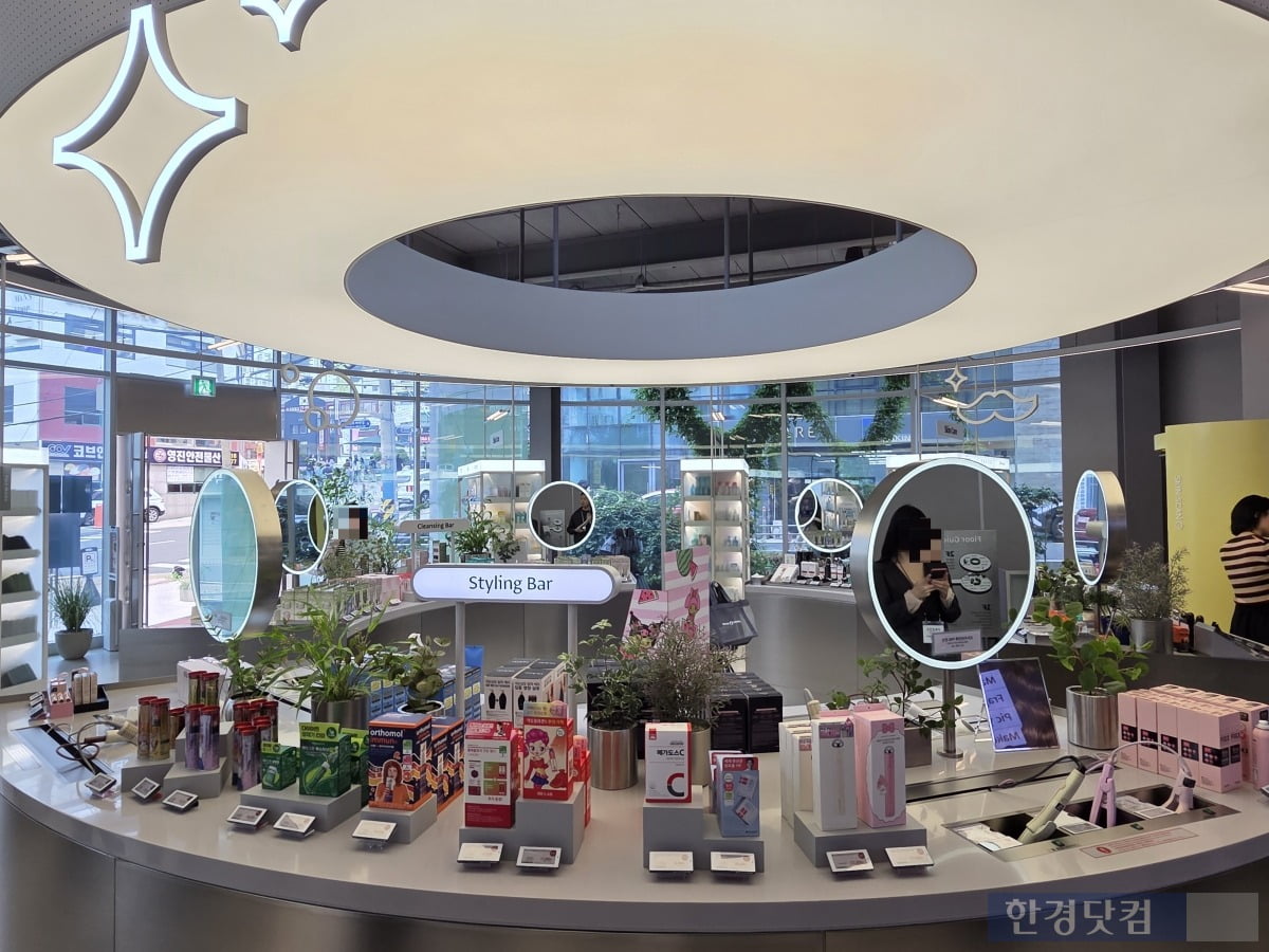 2층은 기초·바디·헤어 브랜드 등을 중점적으로 배치하고 드라이기·고데기·헤어 세럼 등이 구비된 스타일링바와 수전 등을 마련해 소비자가 직접 체험할 수 있도록 했다. 고객 체류 시간을 늘려 구매로 이어지게 하려는 전략이다.