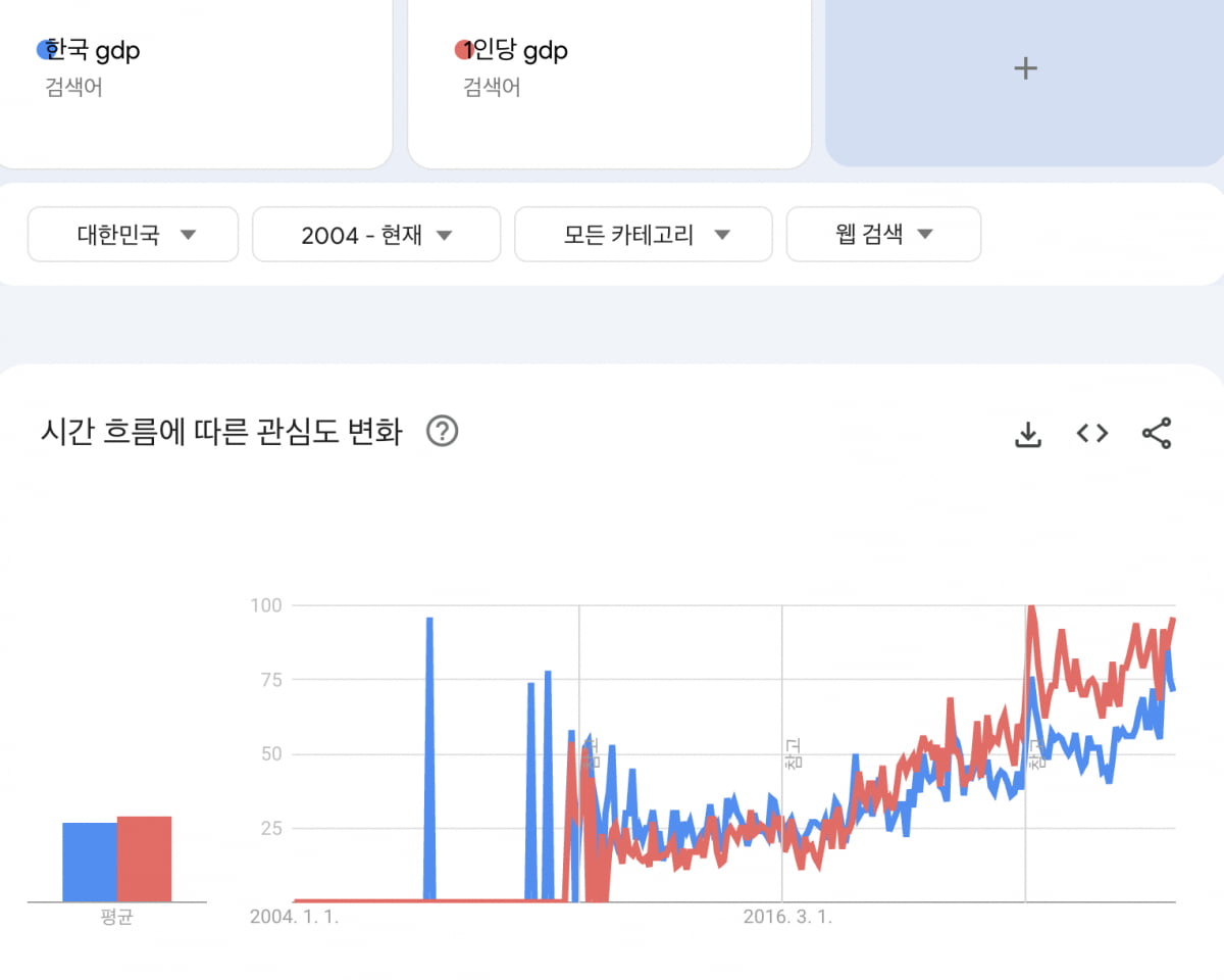 검색량 지표 구글 트렌드(가장 검색량이 많을 때를 100으로 기준)에서 '한국 GDP', '1인당 GDP' 등 한국의 GDP와 관련된 키워드 검색량은 우상향 곡선을 보이는데, 관련 검색어 1~2위는 GDP 순위 관련 키워드다. 그만큼 국가 경쟁력에 대한 관심과 우려가 커진 탓으로 풀이된다.