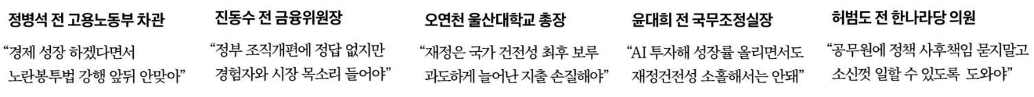 이들은 “AI 대전환으로 잠재성장률을 끌어올린다는 구상은 적절하다”면서도 “재정건전성을 소홀히 해선 안 된다”고 당부했다. 성장을 강조하면서 노란봉투법(노동조합법 2·3조 개정안)을 밀어붙이는 건 이율배반이라는 쓴소리도 남겼다.