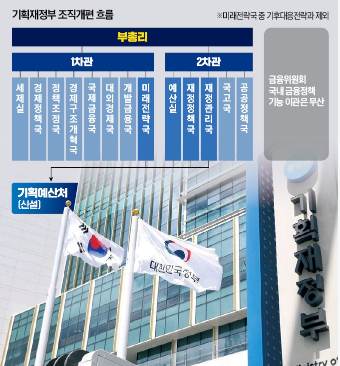기재부는 내년 1월 분리되는 기획예산처와의 인력 배분 문제를 두고서도 몸살을 앓고 있다. 최근 이형일 제1차관과 임기근 제2차관을 중심으로 태스크포스(TF) 조직을 구성하고 기획예산처 신설에 따른 인사 이동안을 마련하고 있다. 예산처엔 기재부 조직도상 예산실과 재정정책국, 재정관리국에 더해 1차관 산하의 미래전략국 중 일부 과가 이동하는 방안이 유력하다. 이 경우 기획조정실이나 대변인실을 제외한 실무 조직에선 실장(1급) 한 자리와 국장(2급) 세 자리만 있는 ‘초미니 부처’가 된다.
