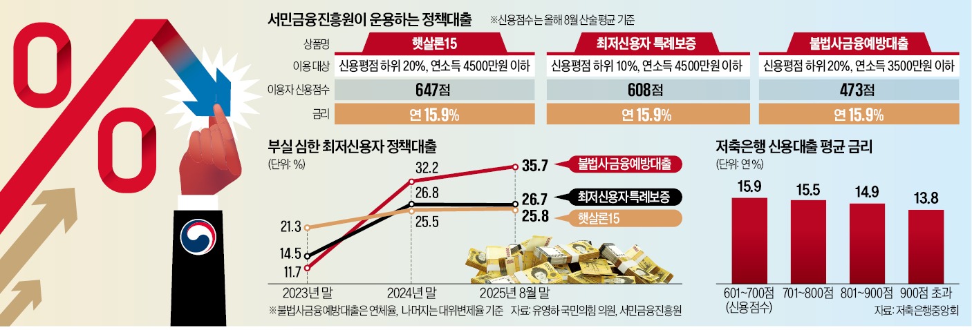 이재명 대통령은 지난달 9일 국무회의에서 정책서민금융을 놓고 “1%대 성장률 시대에 서민들이 연 15% 금리를 감당할 수 있겠느냐”며 제도 개선을 주문했다. 이 대통령은 지난해 12월에도 불법사금융예방대출(옛 소액생계비대출)을 두고 “(연 15.9% 금리는) 정상이 아니다”고 지적했다. 정치권 압박도 거세지고 있다. 김병기 더불어민주당 원내대표는 지난달 16일 “저신용, 저소득일수록 높은 금리를 부담하는 지금의 금융 구조는 역설적”이라고 했다.