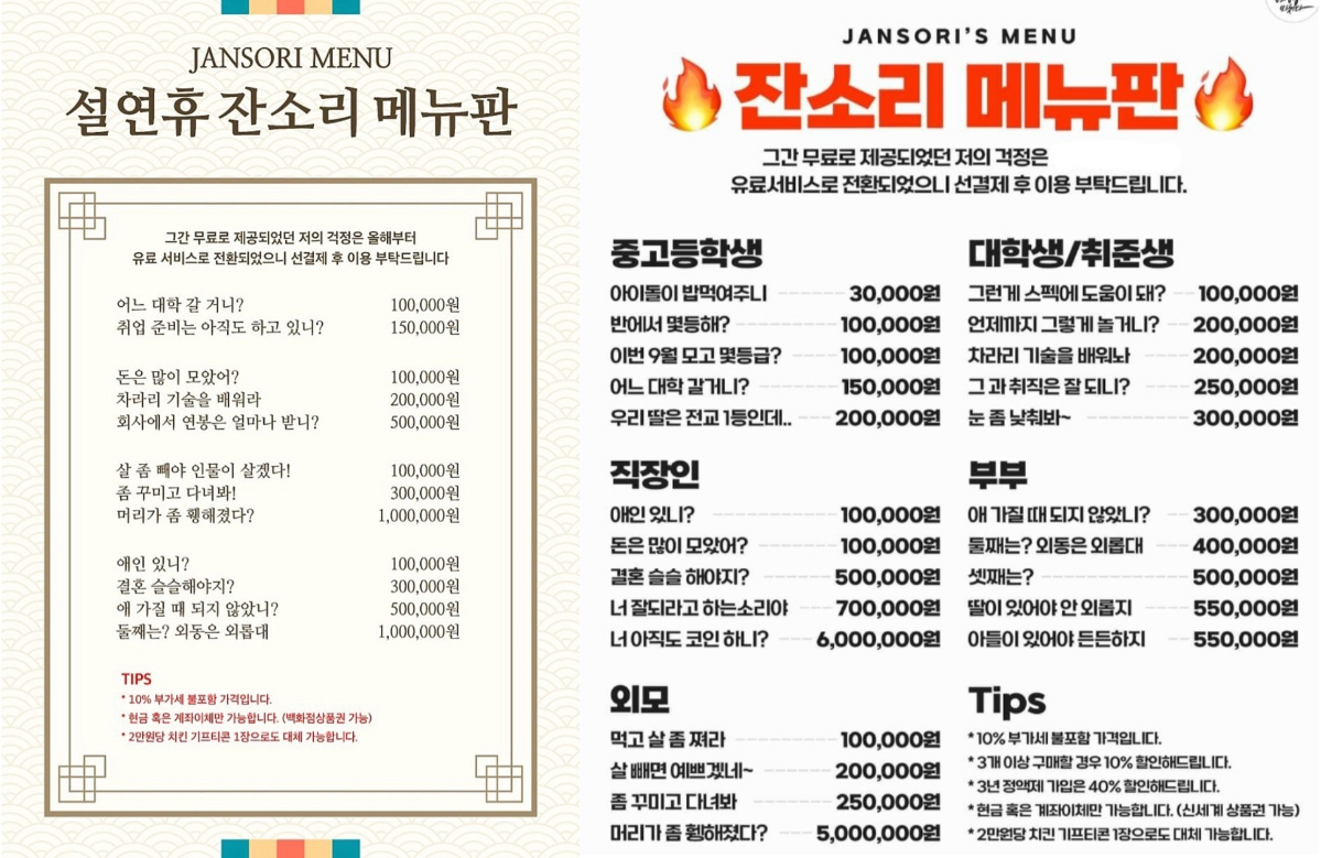 한 메뉴판에는 중고등학생, 대학생·취준생, 직장인, 부부, 외모 등 카테고리별 메뉴판도 제작됐다. '무료로 제공되던 잔소리가 유료 서비스로 전환됐다'는 자조적 문구와 함께 웃을 수도 울 수도 없는 현실을 드러냈다.