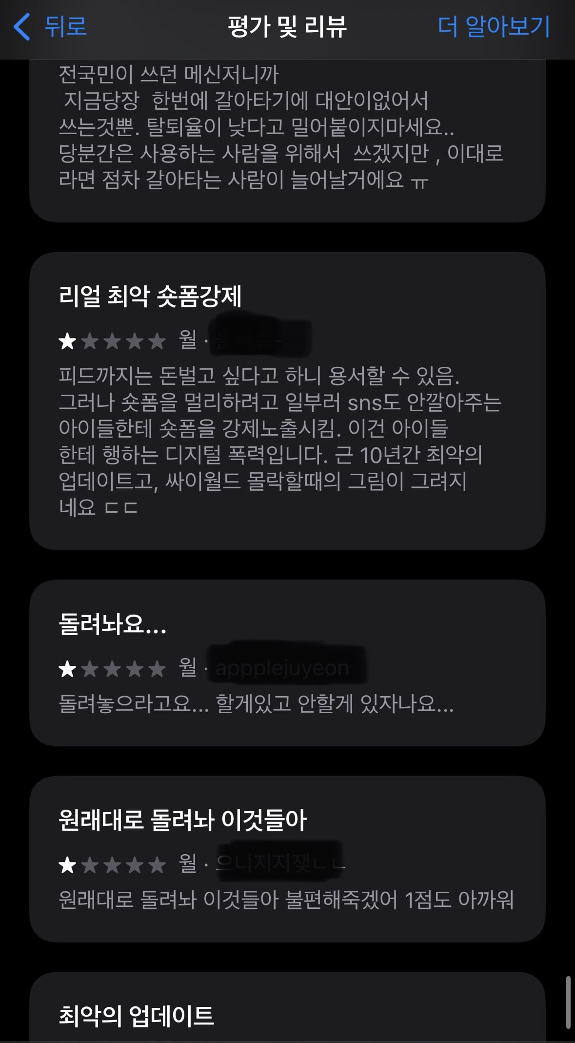 친구탭이 피드처럼 개편되면서 친하지도 않은 사람의 일상을 강제로 봐야 했고 남녀노소 할 것 없이 숏폼에 강제 노출됐다. 24시간 카카오와 함께했던 사용자들은 배신감을 표출했다. 누더기처럼 여기저기 붙은 광고는 사용자의 피로감을 더했다.