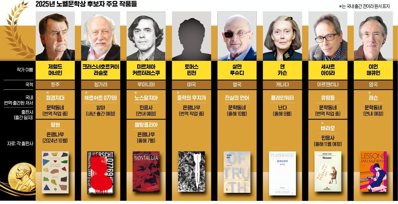 지난해 한강 작가 수상 이후 출판계는 일찌감치 다음 노벨문학상 주인공을 찾아 나섰다. 한림원이 출신 지역과 성별을 안배하는 것은 공공연한 비밀. 올해는 국내문학팀이 아니라 해외문학팀이 야근할 차례다.