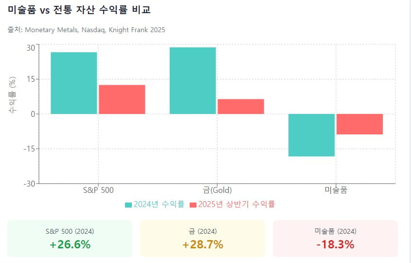 세부 항목을 보면 미술품 부문의 하락 폭은 18.3%로 가장 컸다. 와인(-9.1%), 희귀 위스키(-9.0%) 등 수집형 자산들의 하락도 두드러졌다. 특정 자산군에 대한 선호도 변화가 아니라, 초부유층의 전반적인 위험 회피 성향이 강화된 결과라는 분석이 나온다.