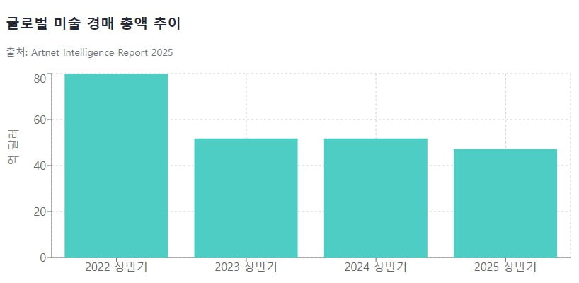 한국 미술 시장 역시 침체 여파를 피하지 못하고 있다. 한국미술시가감정협회에 따르면, 올 상반기 국내 주요 경매사의 총거래액은 약 572억 원이었다 전년 동기 대비 37.6% 감소했다. 최근 5년 중 최저치를 기록했다. 낙찰률은 50%를 하회하는 48.77%까지 떨어졌다. 시장의 활기를 보여주는 최고가 작품의 가격대 역시 낮아졌다. 올 상반기 최고 낙찰가는 16억원에 팔린 이우환의 작품이었다. 1년 전 김환기 작품이 기록한 50억 원의 3분의 1수준에 불과했다.