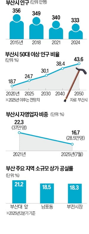 부산이 ‘노인과 바다’라는 별칭으로 불린 지 벌써 수년째다. 지방 소멸 시대를 맞은 부산의 현주소가 이 한마디에 고스란히 담겨 있다. 지역 경기가 활력을 잃으면서 일자리 부족으로 청년들은 해마다 수도권 등으로 떠나고 있다. 부산시 인구는 2020년 352만 명에서 지난해 333만 명으로 4년 새 20만 명 가까이 감소했다. 15~39세 인구 비율은 27.4%로 광역시 중 가장 낮다. 경기 침체로 자영업 폐업이 늘어 상권도 크게 위축됐다.