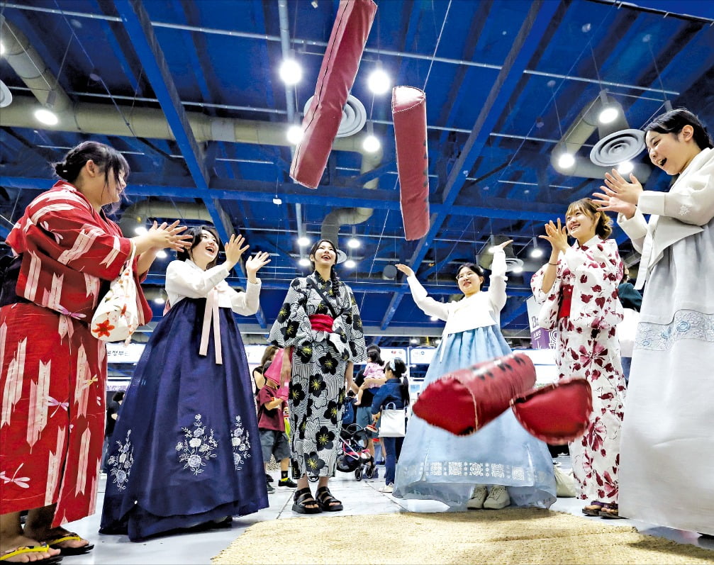 12일 서울 삼성동 코엑스에서 열린 ‘한일축제한마당 2025 인 서울’에서 한복과 기모노를 입은 방문객들이 윷놀이를 즐기고 있다. 한·일 국교 정상화 60주년을 기념해 마련된 이번 행사는 양국 국민이 우호와 교류의 의미를 되새기기 위해 기획됐다. 문경덕 기자 k13759@hankyung.com