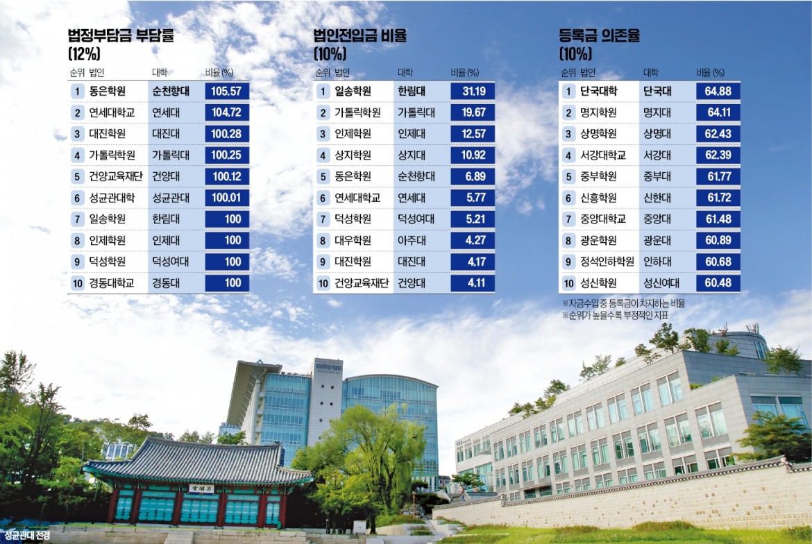 중앙대와 경희대는 각각 종합 9위·7위였지만 법인평가에서는 28위·15위로 밀려났다. 두 법인 모두 법인-대학 재정건전성 부문에서 62위, 65위였다. 중앙대는 합리적 거버넌스 등을 평가하는 지속가능성 부문에서도 52위로 낮은 순위에 머물렀다.