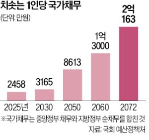 예산정책처는 실질적인 나라 살림을 보여주는 관리재정수지의 적자 규모가 올해 85조5000억원에서 2072년 270조7000억원으로 세 배 넘게 늘어난다고 추산했다. 저출생·저성장이 고착화하고 나라 씀씀이가 더 커지면 1인당 국가채무는 이런 예상보다 더 빠르게 불어난다.