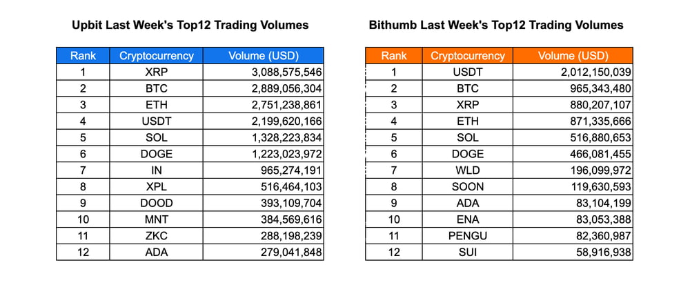 빗썸에서는 USDT(20억 1천만 달러)가 거래량을 이끌었고, BTC(9억 6,500만 달러), XRP(8억 8천만 달러), ETH(8억 7,100만 달러)가 그 뒤를 이었습니다. SOL, DOGE, WLD는 적당한 거래량을 보인 반면, SOON, ENA, PENGU, SUI와 같은 토큰은 규모는 작지만 꾸준한 흐름을 보였습니다. 두 거래소 모두 10월 12일 주말에 동시적인 급등을 경험했으며, 업비트는 빗썸을 큰 차이로 앞지르고 있습니다. 전반적으로 주요 거래소의 유동성은 건전한 수준을 유지했고, 투자자들은 안정성 연계 토큰과 중형주를 선호했습니다. 이는 휴일 휴장 후 시장이 재개되면서 신중하면서도 적극적인 참여를 시사합니다.