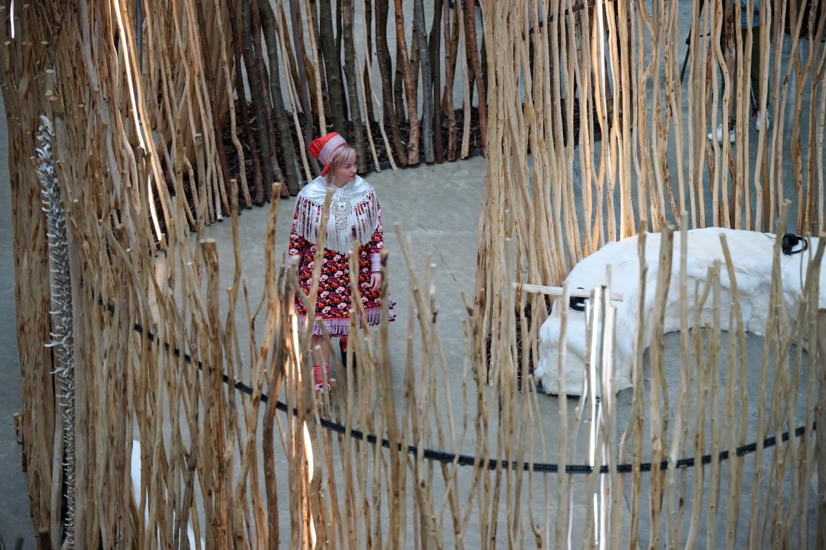 2000년 이후 현대미술계의 가장 상징적인 장소가 되어온 터바인홀에서 지난 14일 조금 특별한 프리뷰 행사가 열렸다. 일반 관람객이 빠져나간 자리에 추운 지방 전통 복장을 한 사람들이 곳곳에서 나타나기 시작했다. ‘Goavve-Geabbil(고아베-게아빌)’이라는 다소 낯선 제목의 이 전시는 노르웨이 스웨덴 핀란드 러시아에 걸친 사프미 지역에 사는 선주민 '사미'출신 작가 마렛 안네 사라가 주인공이다. 그는 사미 생태계와 밀접하거나 순록 목축과 관련한 재료로 조각과 설치작업을 하는 아티스트다.
