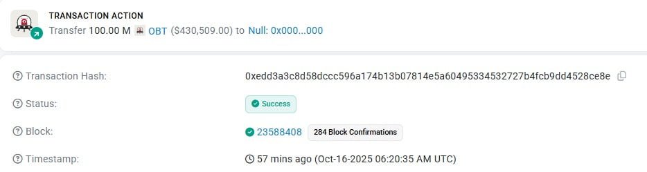 아울러 지난달 프로토콜 수익과 월드리버티파이낸셜(WLFI) 투자 수익을 활용해 추가적인 토큰 매입도 진행했다. 이번 바이백을 통해 소각된 토큰은 전체 유통량의 1%인 1억 OBT에 육박한다. 소각 관련 정보는 블록체인 트랜잭션 기록을 통해 확인이 가능하다.