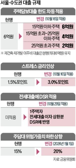 이번 규제는 16일부터 바로 시행된다. 신진창 금융위 금융정책국장은 “최근 서울 집값 분포와 지역별 상승 속도, 주담대 활용 정도 등을 따져 기준선을 정했다”며 “15억원 이하 주택은 서민과 중산층의 수요를 고려해 대출 한도를 현행대로 유지했다”고 설명했다.스트레스 DSR 규제도 강화해 차주의 소득에 따른 대출 한도 역시 줄어든다. 스트레스 DSR은 미래 금리 상승으로 원리금 상환 부담이 커질 위험을 반영해 DSR 산정 시 가산금리를 부과하는 제도다. 가산금리 수준이 높아질수록 대출 한도가 줄어드는 효과가 있다. 이번 대책을 통해 서울·수도권의 스트레스 금리는 기존 1.5%포인트에서 3%포인트로 상향된다.