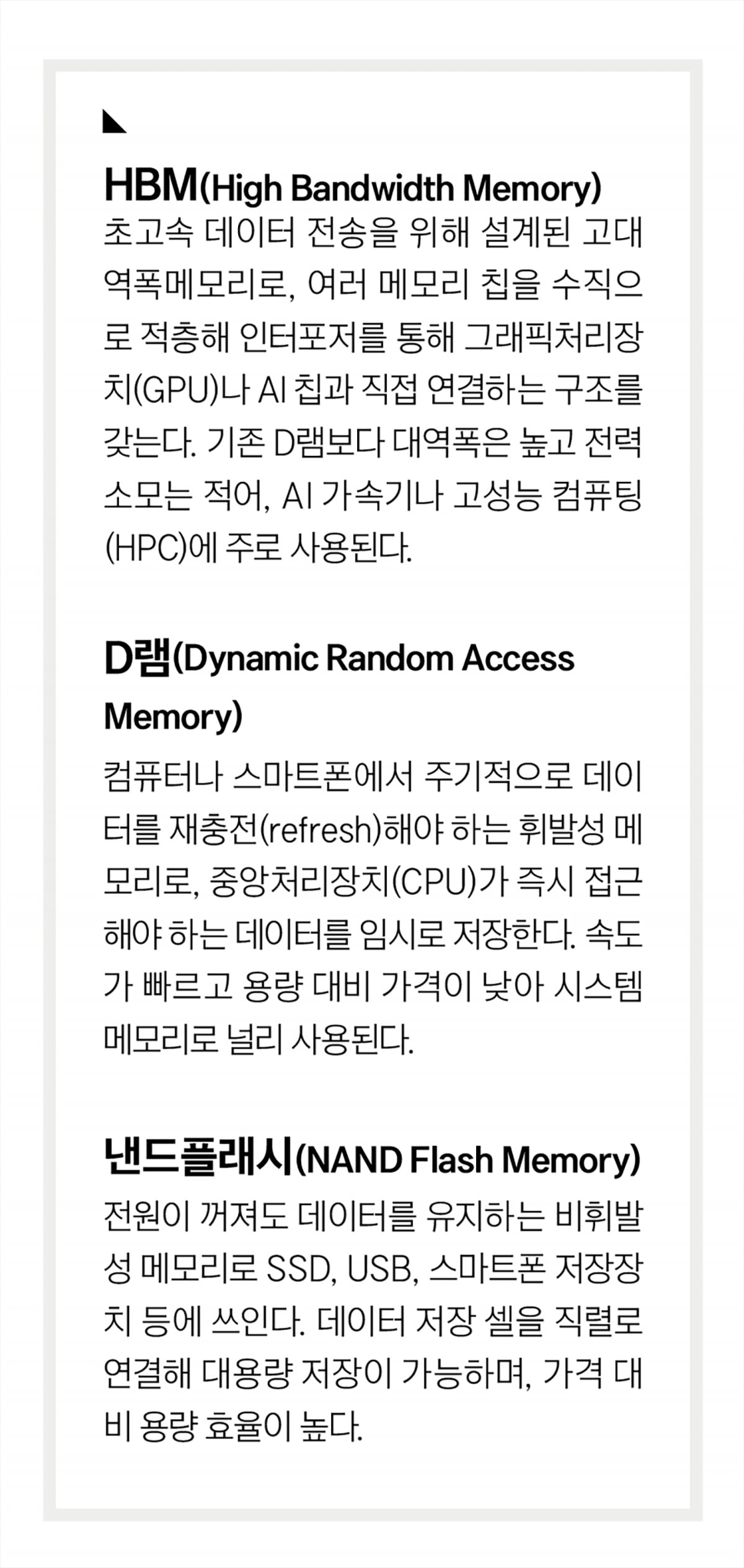 그런데 올 3분기부턴 예상 밖 현상이 추가로 나타났다. HBM뿐 아니라 일반 서버용 D램, 낸드플래시(낸드) 수요가 증가한 것이다. 빅테크들이 AI 데이터센터를 확장하면서 늘어난 서버만큼 서버용 D램이 필요하게 됐다. AI가 고도화한 영향에 서버 한 대당 들어가는 단위 수요도 급증했다. 저장용 메모리인 낸드도 마찬가지다. AI 가속기가 정보를 처리하려면 그 정보를 어디선가 받아오고, 새로 저장해야 해 수요가 늘었다.