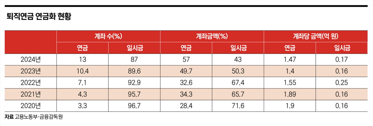 고용노동부에 따르면 퇴직금의 연금 수령 비율은 2020년 말 28.4%(금액 기준)에서 2024년 말 57%로 빠르게 늘고 있다. 다만 현행 통계는 일시금이 아닌 모든 지급 방식을 연금 수령으로 분류하고 있어 한계가 있다. 일시금을 10회 정도로 나눠 지급하는 것을 진정한 의미의 연금(annuity)이라고 보기 어렵기 때문이다.