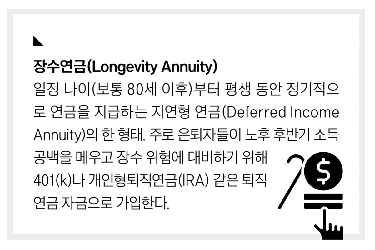 해외의 경우 앞서 지적한 장수 리스크나 인플레이션 리스크 등 노후 재무 리스크를 고려한 다양한 연금 인출 방식이 발전해 있다. 미국은 장수 리스크를 대비해 장수연금을 활성화하고 평생 소득 확보를 위해 퇴직계좌에서 연금 가입 운용을 장려하는 'SECURE법'을 2019년 제정했다. 장수연금은 보험료를 일시에 납입한 후 80세 이후 연금을 수령하는 상품이다.
