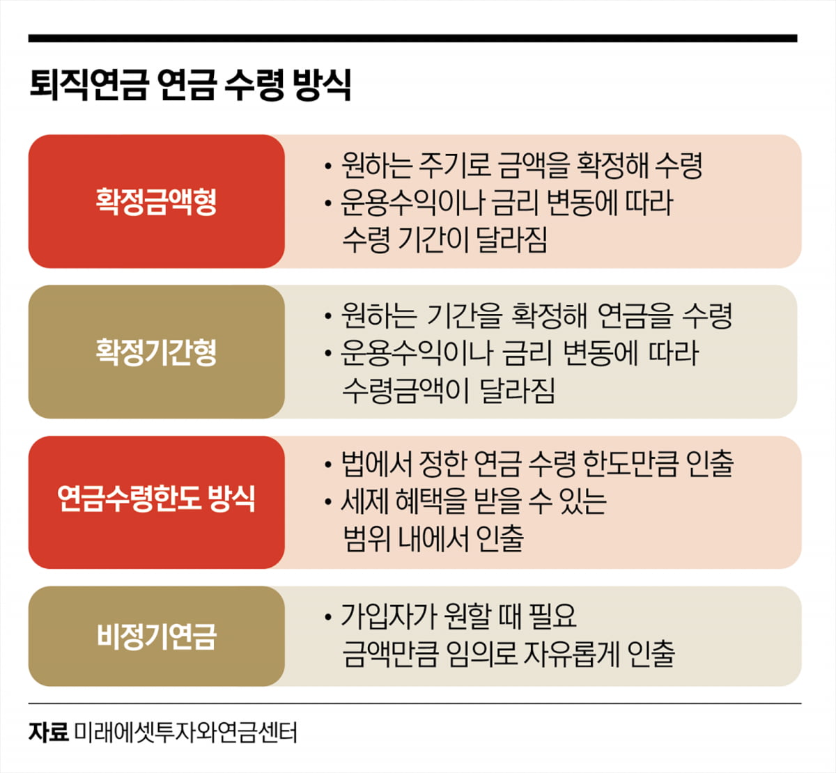 국내 금융 회사들이 제공하는 연금 인출 방식은 아직 단순한 수준이다. 원하는 주기로 금액을 확정하는 ‘확정금액형’이나 원하는 기간을 확정해 연금을 수령하는 ‘확정기간형’, 법에서 정한 연금 수령 한도만큼 인출하는 ‘연금수령한도 방식’, 가입자가 원할 때 필요 금액만큼 임의적으로 자유롭게 인출하는 ‘비정기연금’ 등이다. 본격적인 사적연금의 인출이 초기 단계이기 때문이다.